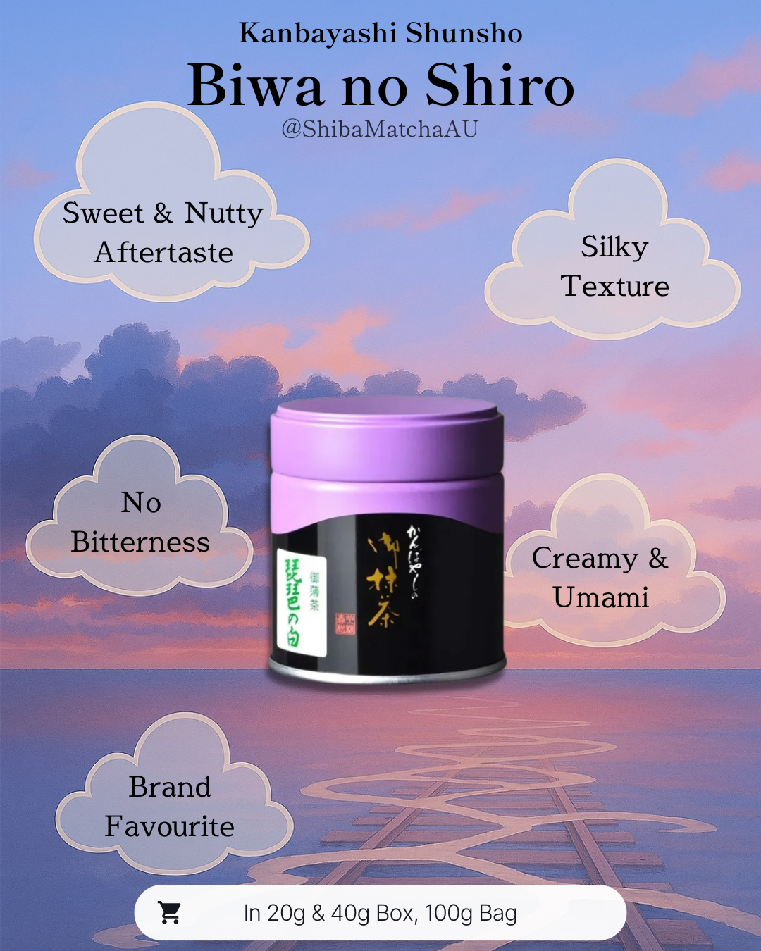 Named after the Biwa tea garden, one of the seven historic Uji Shichimeien gardens established by Shogun Ashikaga Yoshimitsu, best known for building the Golden Pavilion. In the Kanbayashi Shunsho usucha portfolio, Biwa no Shiro stands as a mid-tier, high-quality usucha that reflects centuries of tea craftsmanship.